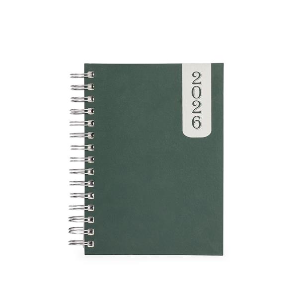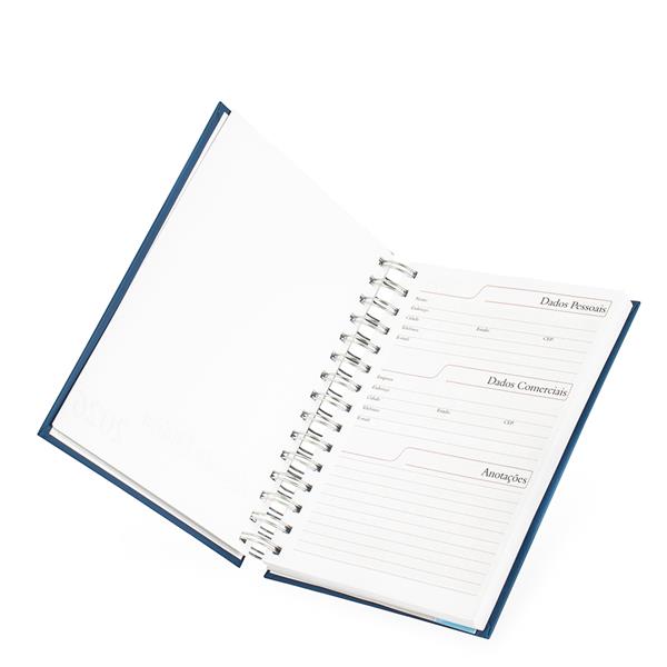 Agenda diária wire-o com capa produzida em prime, contém bolso plástico atrás da capa, dados pessoais, calendário de 2024 à 2026, mapa do Brasil, mapa-múndi, índice telefônico e planejamento.