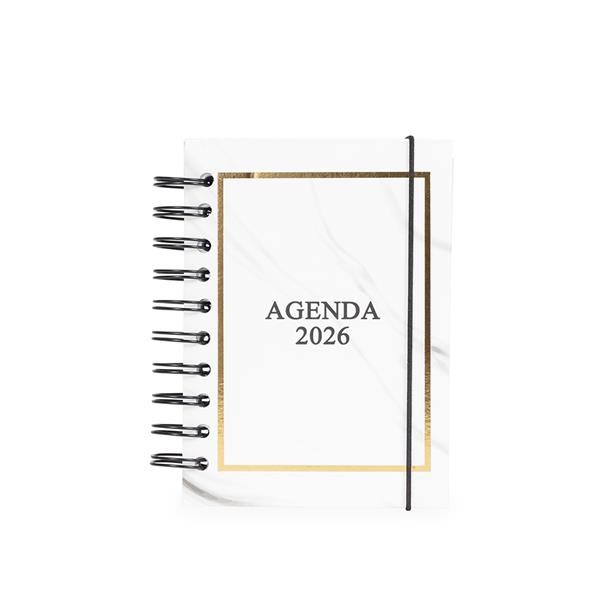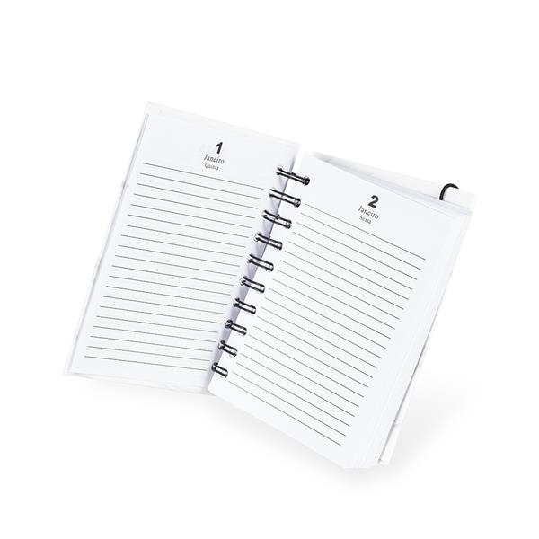 Agenda diária 2026 com capa dura, elástico de fechamento, marca páginas de fita de cetim e encadernação Wire-O. Conta ainda com páginas dedicadas a dados pessoais, calendários de 2026 até 2028, além de listas de metas, planejamento mensal e contatos. Largura : 12 cm Espessura : 2,4 cm Comprimento : 15 cm Peso aproximado (g): 181