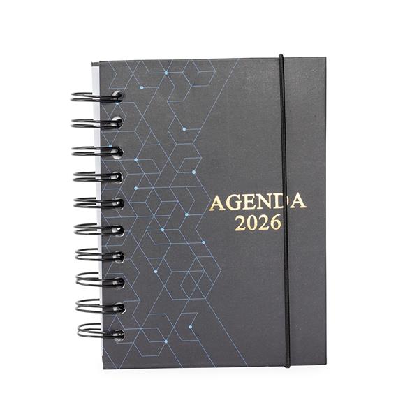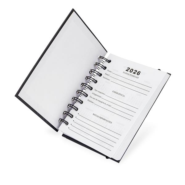 Agenda diária em capa dura com elástico para fechamento, marca páginas em fita de cetim e encadernação wire-O. Conta ainda com páginas dedicadas a dados pessoais, calendários de 2026 e 2028, listas de metas, planejamento mensal e contatos.