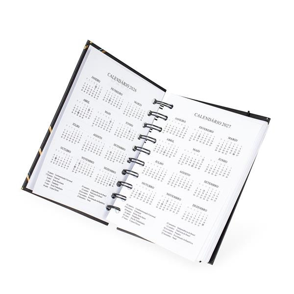 Agenda diária 2026 em capa dura, com marcador de páginas em fita se cetim, elástico de fechamento e encadernação Wire-O. Conta ainda com páginas dedicadas a dados pessoais, calendários de 2026 até 2028, além de listas de metas, planejamento mensal e contatos.