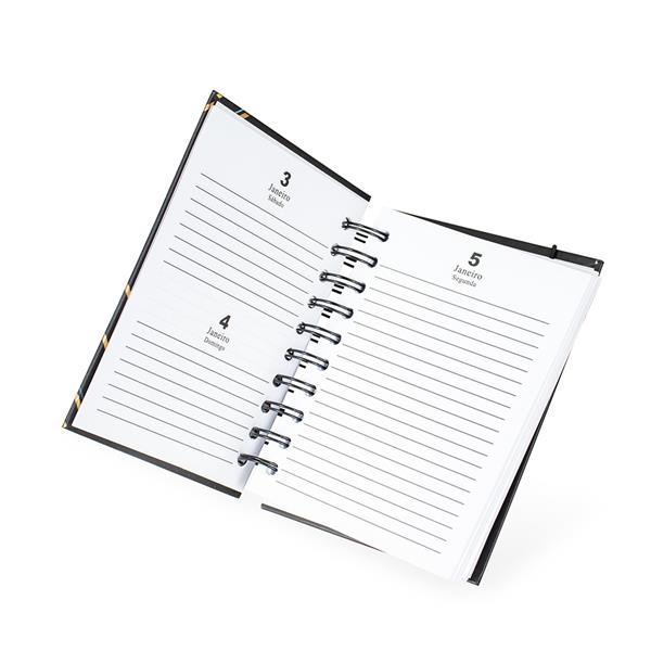Agenda diária 2026 em capa dura, com marcador de páginas em fita se cetim, elástico de fechamento e encadernação Wire-O. Conta ainda com páginas dedicadas a dados pessoais, calendários de 2026 até 2028, além de listas de metas, planejamento mensal e contatos. Largura : 12 cm Espessura : 2,4 cm Comprimento : 15 cm Peso aproximado (g): 180