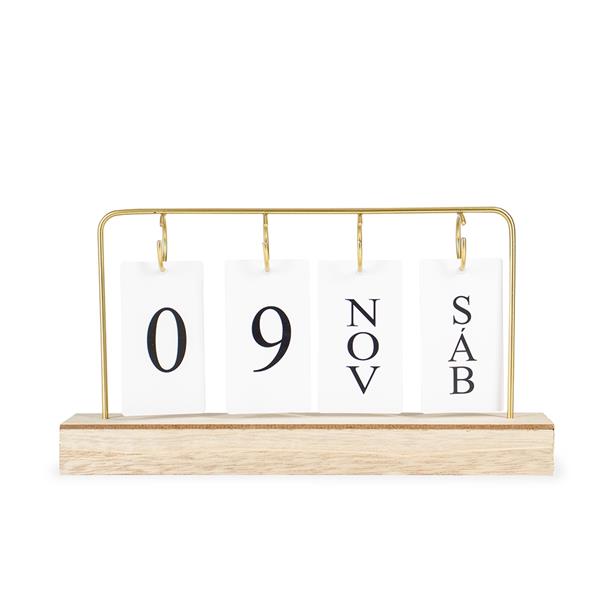 Calendário permanente de mesa com base feita em MDF e moldura de ferro. Conta com fichas em papel cartão que permitem montar a data, trazendo o dia em números e o mês e os dias da semana em versões abreviadas. Altura : 16 cm Profundidade : 5,4 cm Espessura : 3 cm Comprimento : 29,3 cm Peso aproximado (g): 272