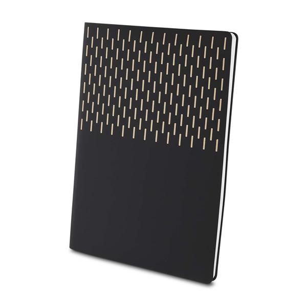 Conjunto composto por caderno com capa em PU com detalhe de gravação dourada, contendo 80 folhas pautadas em papel 70g/m², possui caneta modelo twist em alumínio reciclado na cor do caderno, com acabamento em detalhe dourado, possui estojo em papelão na cor preta.