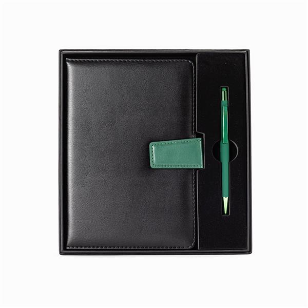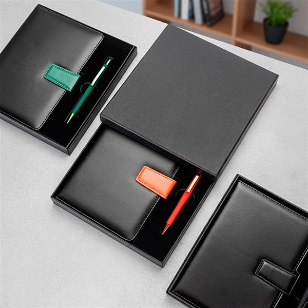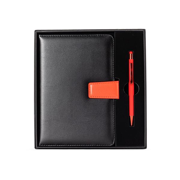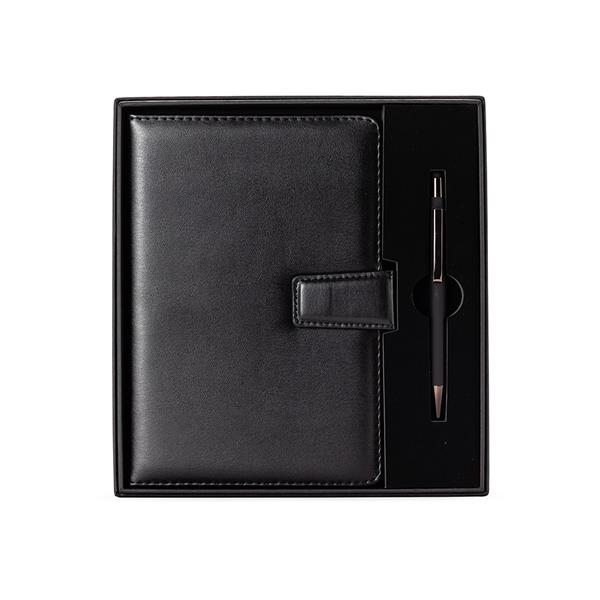 Kit executivo com duas peças, composto por uma caderneta de capa em couro sintético com fechamento magnético e cerca de 20 folhas pautadas, e uma caneta em metal com detalhes em plástico, ponteira emborrachada para uso em dispositivos touchscreen e carga esferográfica azul de 1,0 mm. Acompanha uma caixa de papelão com berço em espuma para a caneta.