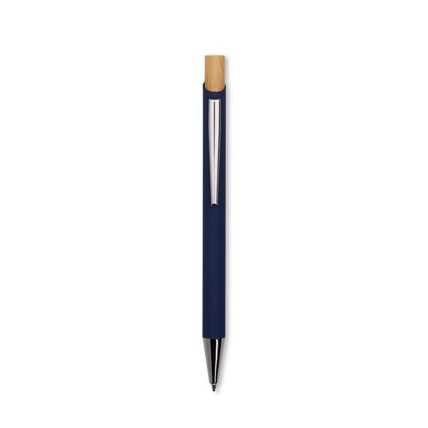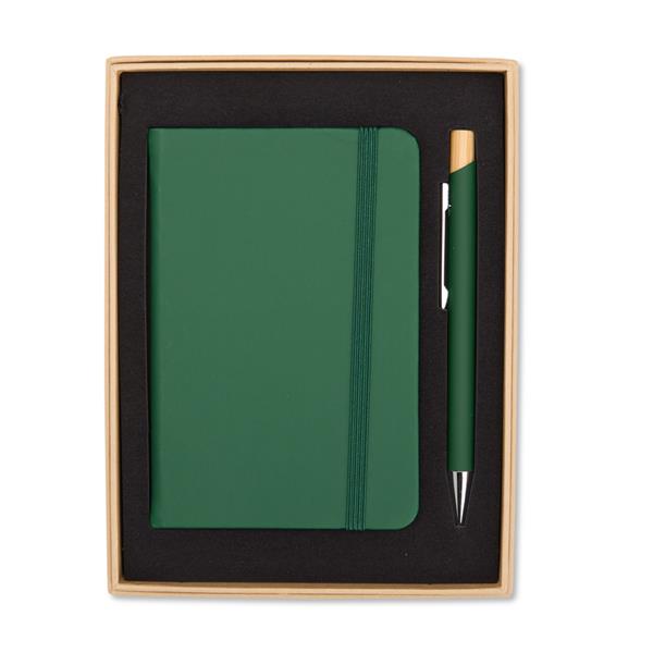 Kit executivo composto por uma caderneta e uma caneta. A caderneta possui capa dura, marca-páginas em fita de cetim e elástico para fechamento, além de aproximadamente 80 folhas com pauta. Por sua vez, a caneta metálica conta com detalhe em bambu, acionamento por clique e carga esferográfica azul de 1,0mm. Acompanha uma caixa de papelão com berço interno em espuma.