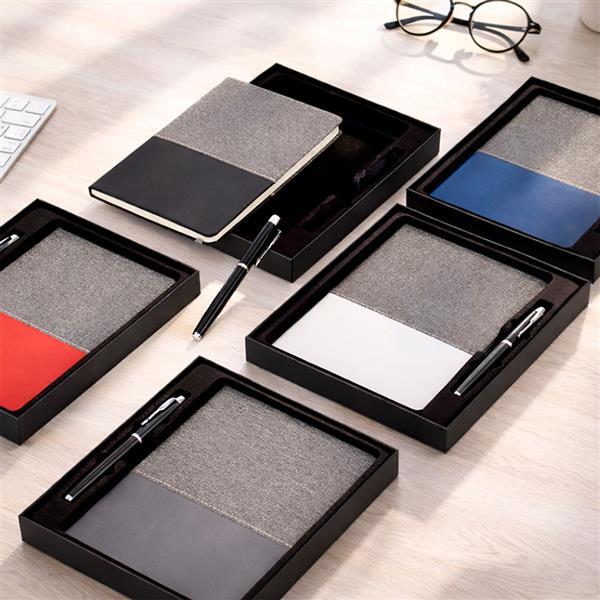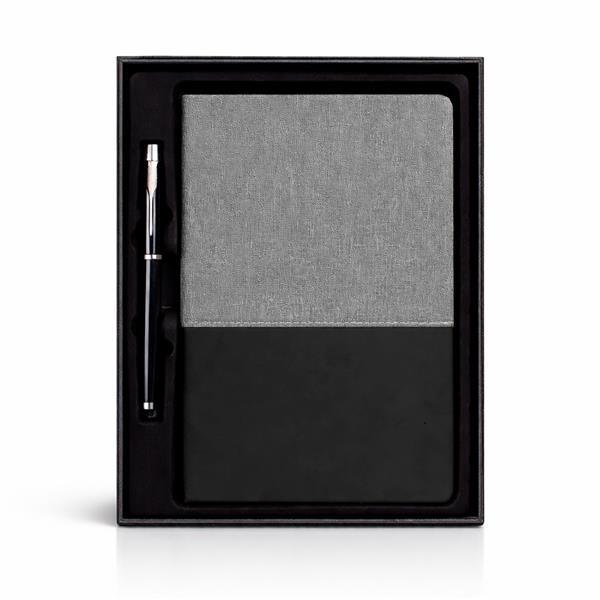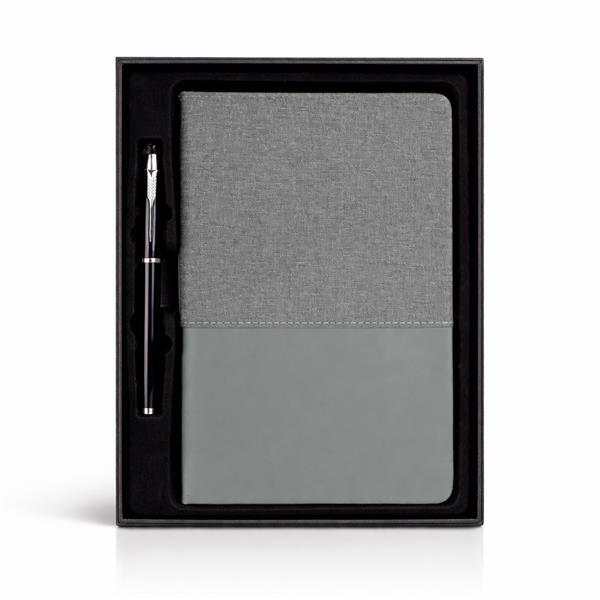 Kit executivo composto por dois itens: uma caderneta e uma caneta. A caderneta possui capa em PU, fecho em elástico, marca páginas em fita de cetim e cerca de 80 folhas marfim pautadas. A caneta metálica possui ponta em plástico ABS e carga esferográfica preta de 0,8 mm. Acompanha caixa em papelão com berço em PET com revestimento aveludado para acomodação dos itens.