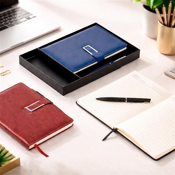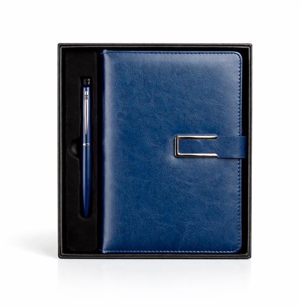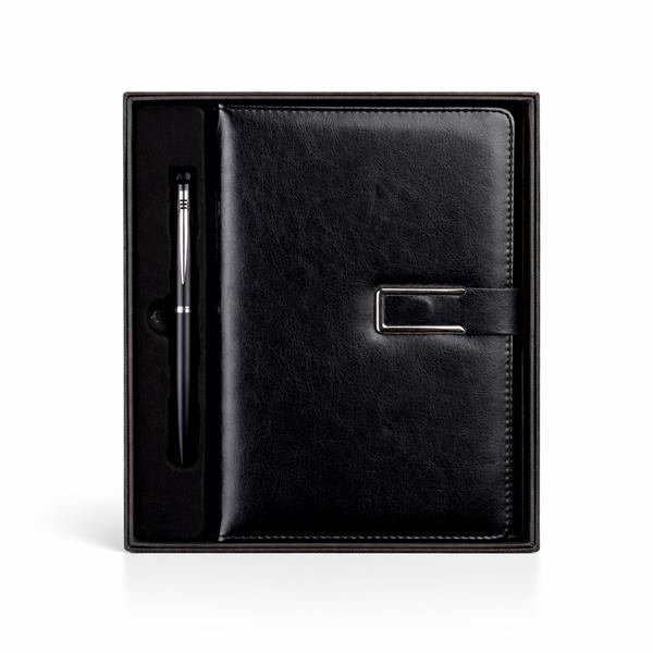 Kit executivo composto por dois itens: uma caderneta e uma caneta. A caderneta possui capa em couro sintético, fecho magnético com detalhe metálico na aba, marca páginas em fita de cetim e cerca de 96 folhas marfim pautadas e espaço para assinalar dias da semana e datas numéricas. A caneta metálica conta com acionamento por rotação e carga esferográfica azul de 1,0mm. Acompanha caixa em papelão com berço em plástico para guardar os itens do conjunto.