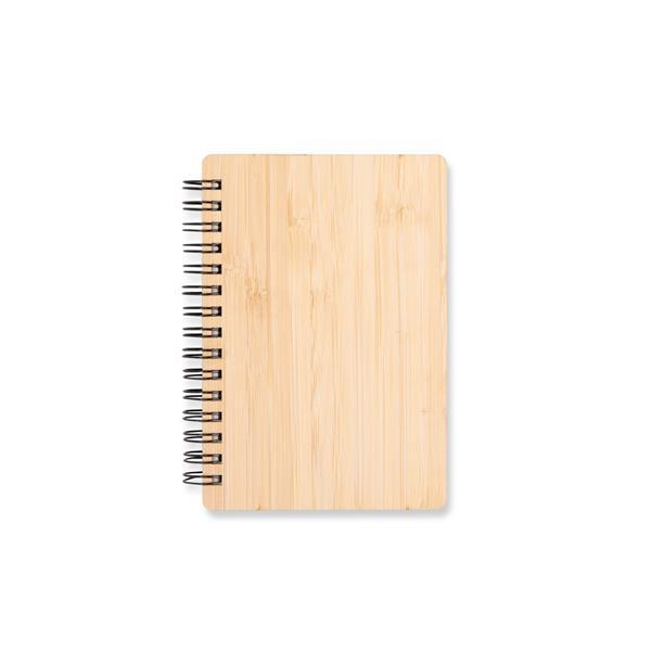 Kit executivo ecológico em bambu composto por três itens: um caderno capa dura com encadernação Wire-O e aproximadamente 68 folhas na cor marfim pautadas; caneta com detalhes em metal, topo emborrachado para uso em dispositivos touchscreen, acionamento por clique e carga esferográfica azul de 1,0 mm; e chaveiro com argola e placa personalizável em metal. Acompanha embalagem em papelão com berço em espuma para acomodação dos itens.