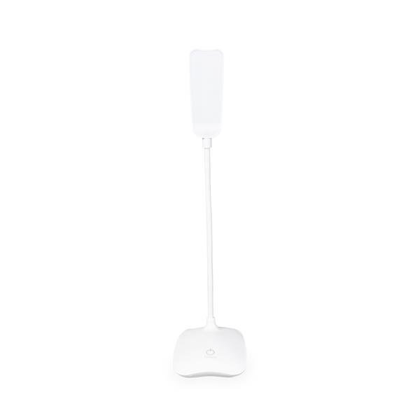 Luminária recarregável com 16 LEDs, estrutura em plástico e haste articulável em múltiplos ângulos. Possui acionamento por toque na base para a seleção de três níveis diferentes de iluminação e entrada Micro USB. Acompanha cabo micro USB para carregamento.
