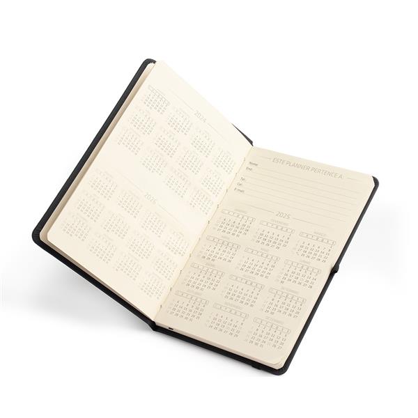 Planner com capa dura emborrachada, marca páginas em fita de cetim, elástico para fechamento e suporte para caneta. Apresenta páginas dedicadas a dados pessoais, calendários de 2025 até 2027 e espaço para anotações diárias e semanais ao longo de todo ano de 2026.