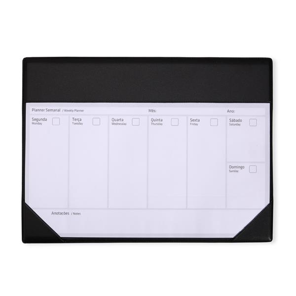 Planner semanal de mesa com base em papelão revestida em PVC. Acompanha bloco com cerca de 20 folhas destacáveis em tamanho A4 para anotações semanais.