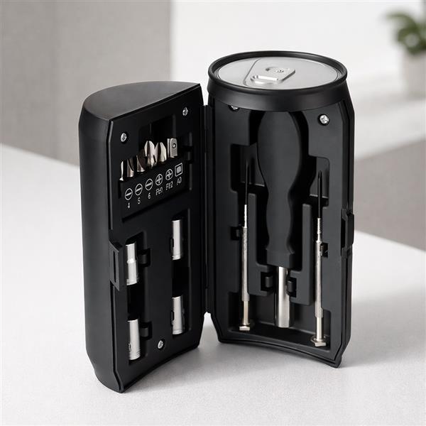 Kit de ferramentas com 13 peças em aço carbono. O conjunto conta com chave porta-bits magnética com cabo em polipropileno (PP), seis bits em formatos diferentes, sendo 3 de fenda, 2 Phillips e 1 adaptador para soquetes, além de duas chaves de precisão e 4 soquetes sextavados. Acompanha caixa plástica em formato de lata de bebida, com trava de fechamento. Altura : 14,2 cm Largura : 7,2 cm Peso aproximado (g): 253