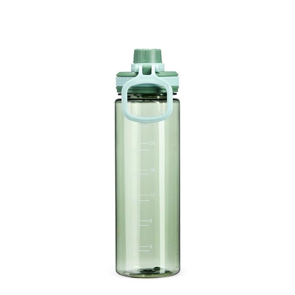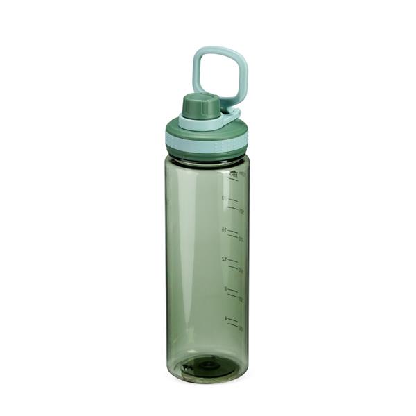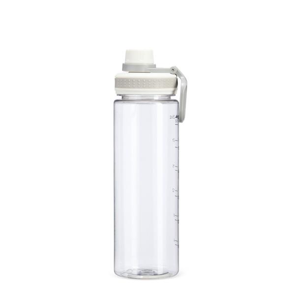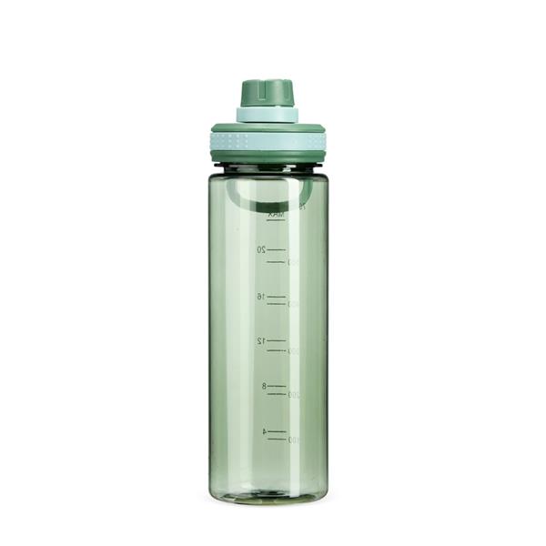 Garrafa plástica com capacidade máxima de 750 ml e marcação impressa de volume de até 700 ml. Possui tampa rosqueável com protetor para o bocal e alça para transporte.