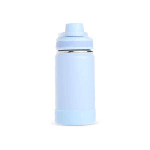 Garrafa térmica em inox, pintura eletrostática e capacidade para até 350 ml. Conta com estrutura de parede dupla e vedação a vácuo, permitindo conservar a temperatura de líquidos por mais tempo. Possui tampa rosqueável com protetor para o bocal e alça fixa para facilitar o transporte. Acompanha protetor para a base em silicone.