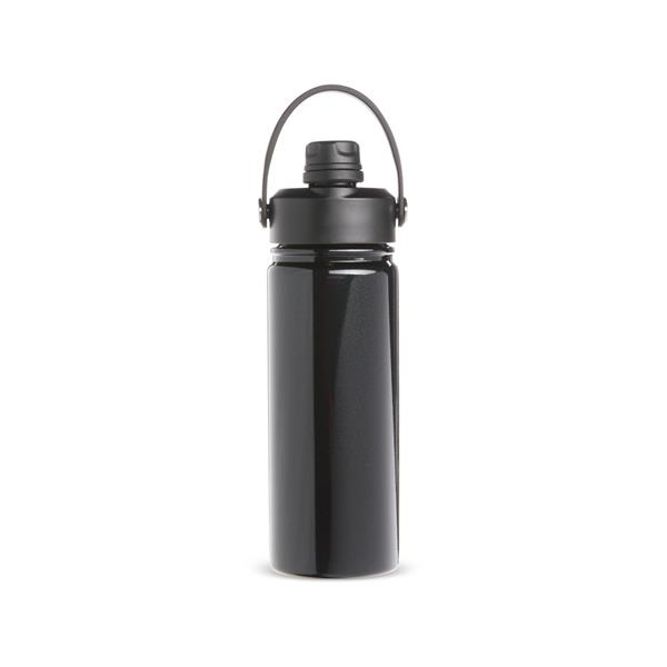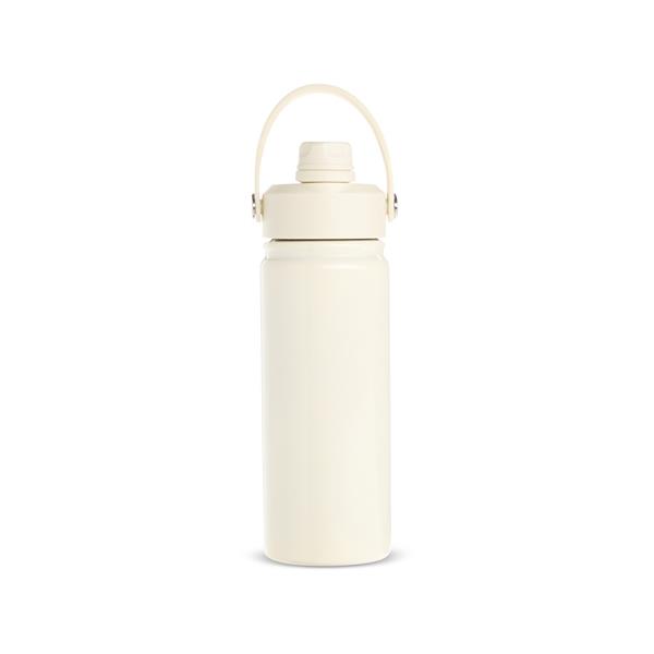 Garrafa térmica em aço inox 304 e capacidade para até 600 ml. Apresenta estrutura de parede dupla e vedação a vácuo, oferecendo a conservação da temperatura de líquidos por mais tempo. Possui tampa rosqueável feita em plástico com proteção para o bocal, bico flip, canudo interno removível e alça fixa para transporte.