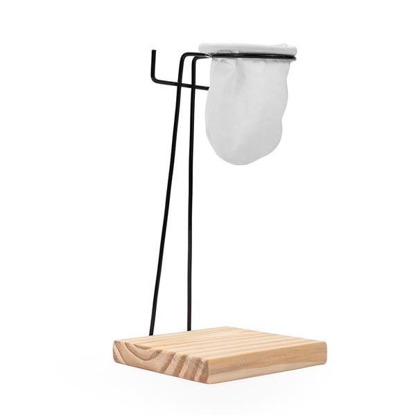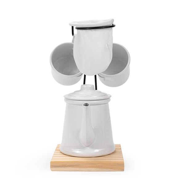 Um kit completo para preparar um café de forma especial em qualquer ocasião. O conjunto contém: 1 bule em alumínio com capacidade de 300ml, 2 xícaras em alumínio de 90ml cada e 1 coador em tecido com suporte de metal e base em madeira.