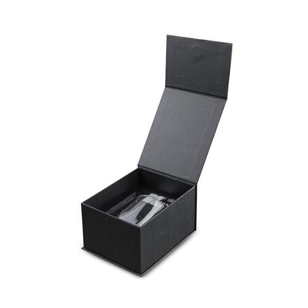 Kit drink contendo, contendo 1 copo grande de vidro, 1 pinça para gelo, 1 bolsa de veludo e 4 pedras de granito para gelo, acondicionado em caixa presenteável.