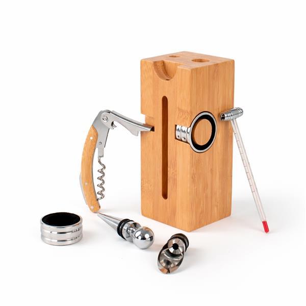 Kit vinho composto por 6 itens: saca-rolhas de um estágio em inox com cabo de bambu, dois anéis corta-gotas (wine collar) em liga de zinco e feltro, termômetro em vidro com detalhes em liga de zinco, além de bico dosador em liga de zinco com detalhes em silicone e tampa de bico em inox, com partes em zinco e silicone. Acompanha suporte em bambu para acomodar os itens do conjunto.