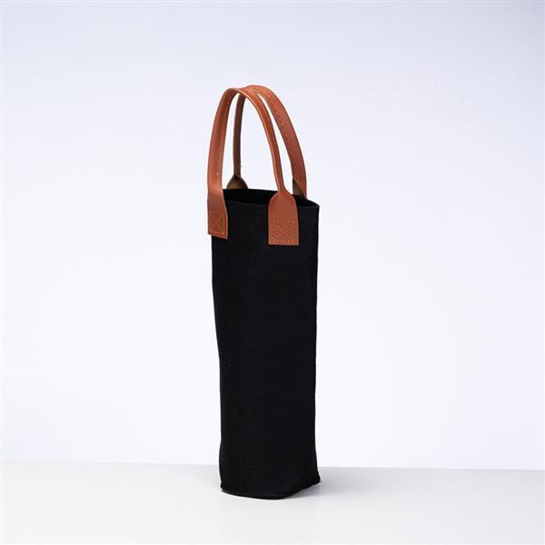 Sacola porta vinho confeccionada em feltro e alças de mão em couro sintético.