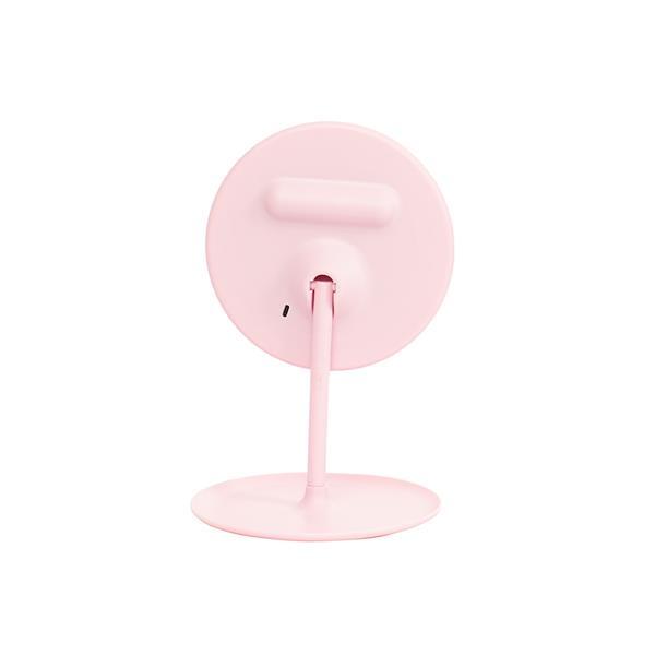 Espelho de mesa com estrutura montável em plástico, movimentação vertical de até 90 graus, iluminação em LED com três níveis de ajuste e entrada USB-C para recarga. Acompanha cabo USB-C.