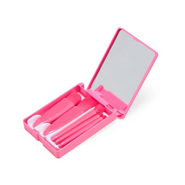 Tudo o que você precisa para uma maquiagem perfeita! Com estojo prático em plástico com trava, espelho e 5 pincéis, é possível se maquiar a qualquer hora e lugar. Cada pincel tem uma função: o de corretivo para suavizar imperfeições, o de esfumar para um olhar natural, e o de batom para aplicação precisa. Esse kit é perfeito para deixar a beleza sempre em dia.