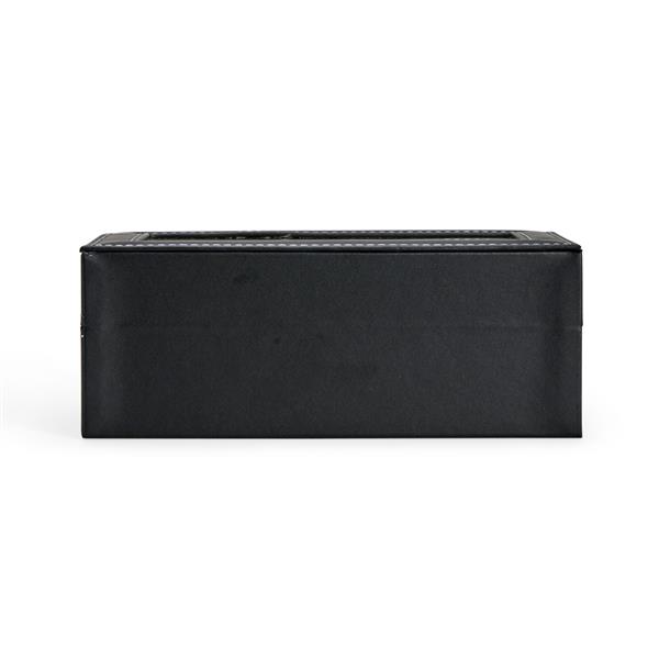 Porta relógios com acabamento em couro sintético à base de PVC. Possui revestimento interno em veludo e quatro compartimentos fixos com almofadas removíveis de espuma. Conta ainda com visor transparente em vidro e trava de segurança para o fechamento do estojo. Altura : 8 cm Profundidade : 10,7 cm Comprimento : 20,7 cm Peso aproximado (g): 420