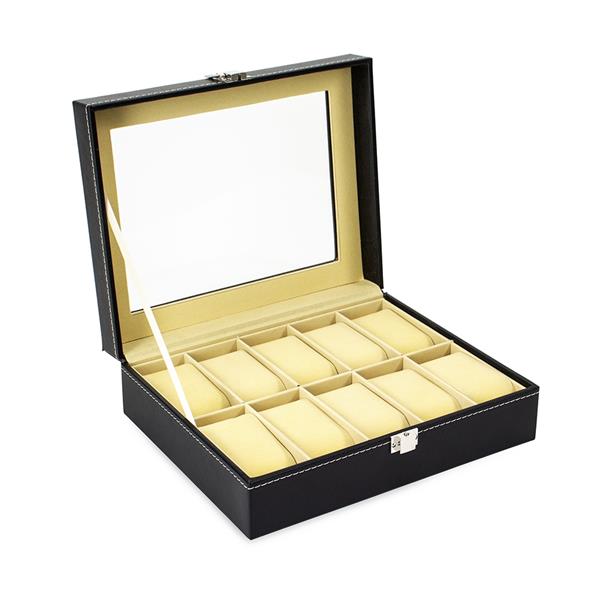 Porta-relógios com acabamento em couro sintético à base de PVC e revestimento interno em veludo. Conta com 10 compartimentos fixos com almofadas removíveis em espuma, além de visor de vidro e trava de segurança para o fechamento do estojo.