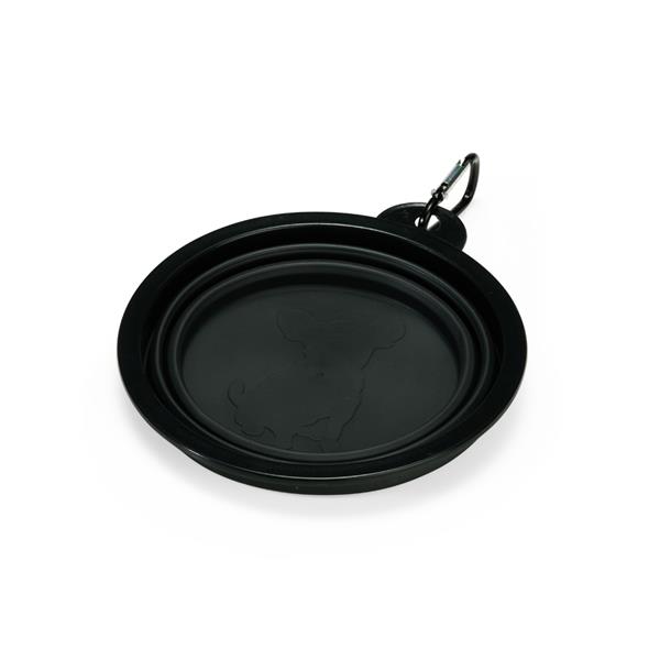 Tigela retrátil para pets feita em silicone com borda plástica equipada com encaixe para mosquetão e capacidade de até 350 ml. Acompanha mosquetão metálico para facilitar o transporte.