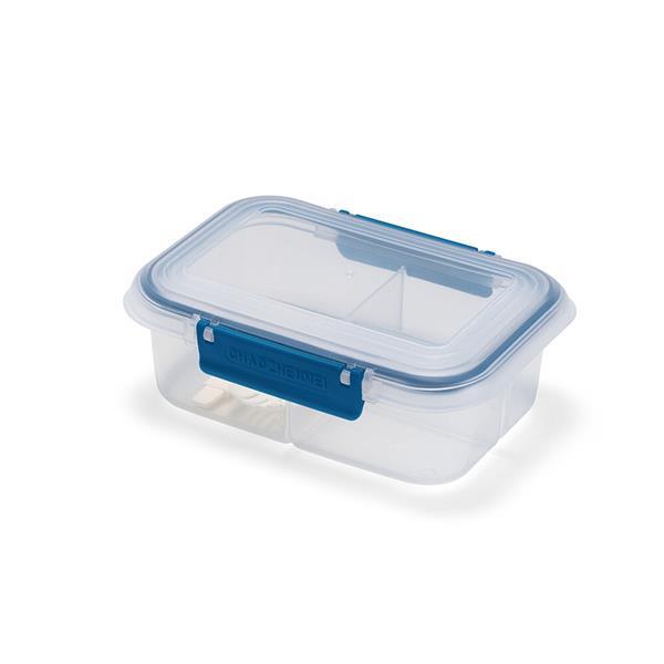 Marmita em plástico polipropileno (PP) livre de BPA com capacidade máxima de 650 ml. Possui três divisórias fixas, tampa hermética com anel de vedação em silicone e duas travas laterais. Acompanha colher tipo spork em PP. Altura : 6,6 cm Largura : 17,6 cm Profundidade : 8,5 cm Peso aproximado (g): 130