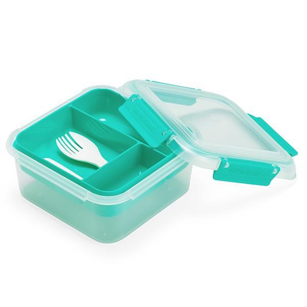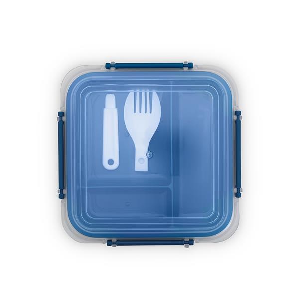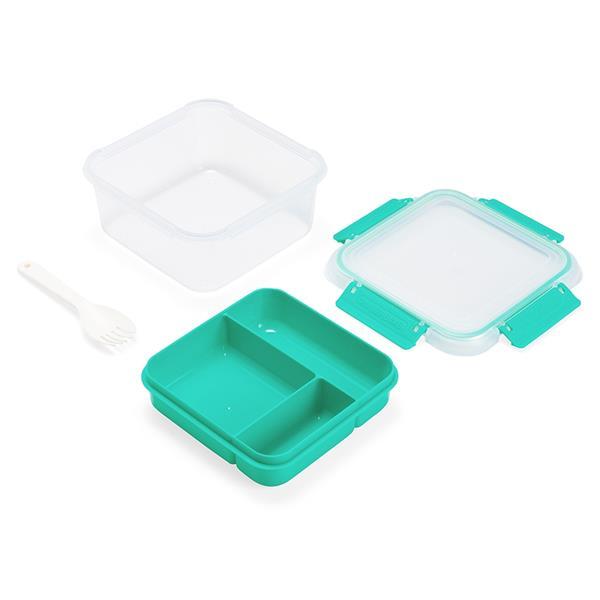 Marmita em plástico polipropileno (PP) livre de BPA com capacidade máxima de 1 litro combinada com a divisória removível. Possui tampa hermética com anel de vedação em silicone e quatro travas laterais. Acompanha colher tipo spork em PP. Altura : 7,9 cm Largura : 16,7 cm Profundidade : 12 cm Peso aproximado (g): 216