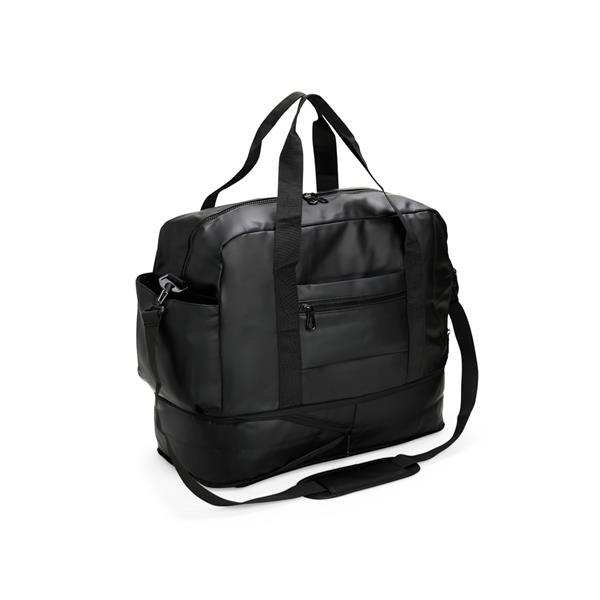Bolsa confeccionada em filme sintético tipo couro impermeável com capacidade de até 25 litros. Possui compartimento interno amplo com bolso em tela e fechamento em zíper, além de quatro bolsos externos de tamanhos variados e fechamento em zíper e um em tela com elástico. Apresenta alças de mão com suporte de juntura e um par de alças ocultas na parte inferior da bolsa, que permitem seu uso como mochila. Contém alça transversal removível. Altura : 22,5 cm Largura : 48 cm Profundidade : 25 cm Peso aproximado (g): 868