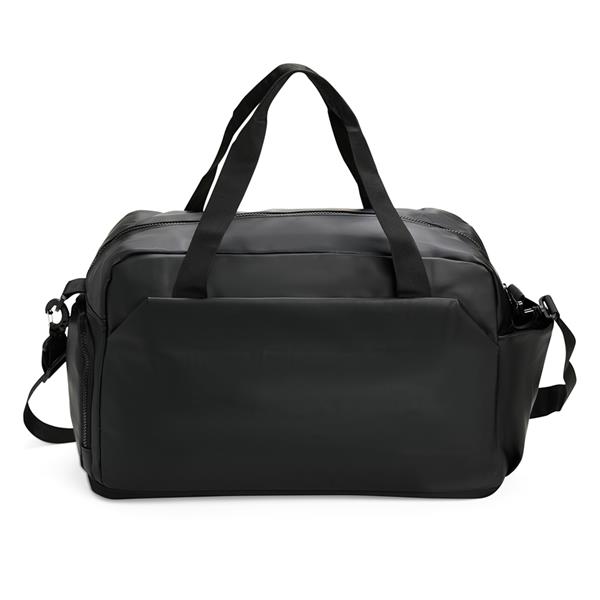 Bolsa confeccionada em filme sintético tipo couro impermeável com capacidade de até 25 litros. Possui compartimento interno amplo com bolso em tela e fechamento em zíper, além de quatro bolsos externos de tamanhos variados e fechamento em zíper e um em tela com elástico. Apresenta alças de mão com suporte de juntura e um par de alças ocultas na parte inferior da bolsa, que permitem seu uso como mochila. Contém alça transversal removível.