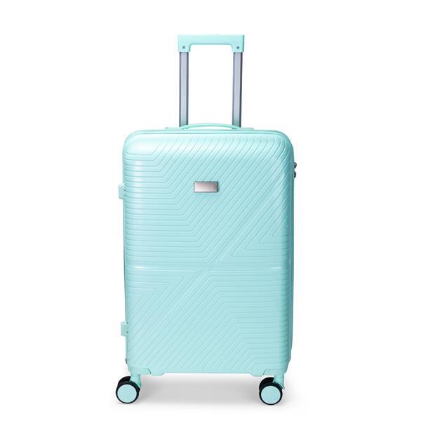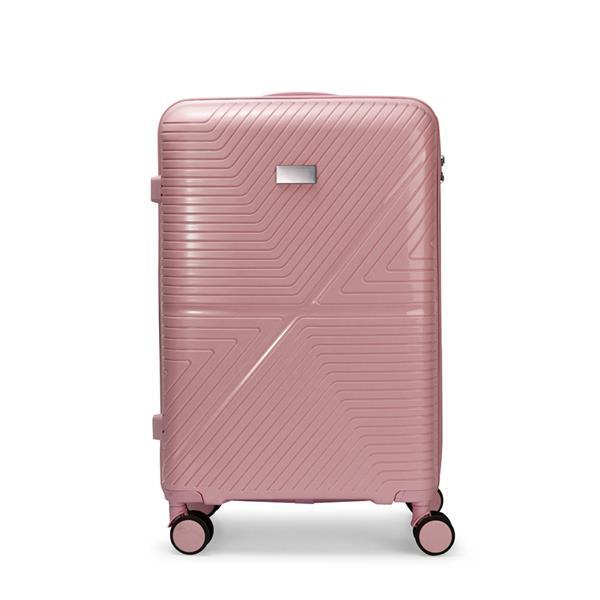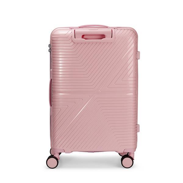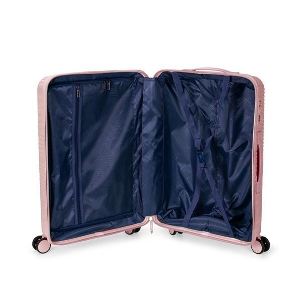 Mala de viagem em plástico resistente com fechamento em zíper e capacidade máxima de 54 litros. Dispõe de compartimento com fechamento em zíper e bolso superior em tela de malha, além de cinta compressora no lado oposto para organização de objetos. Conta com duas alças de mão, uma superior e outra lateral, quatro apoios laterais, dois pares de rodinhas com giro em 360 graus, puxador metálico retrátil com alça plástica e cadeado numérico TSA. Acompanha placa em metal para personalização.
