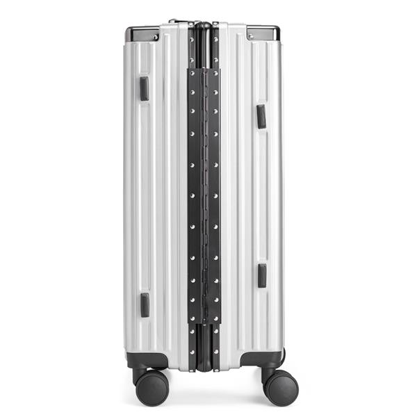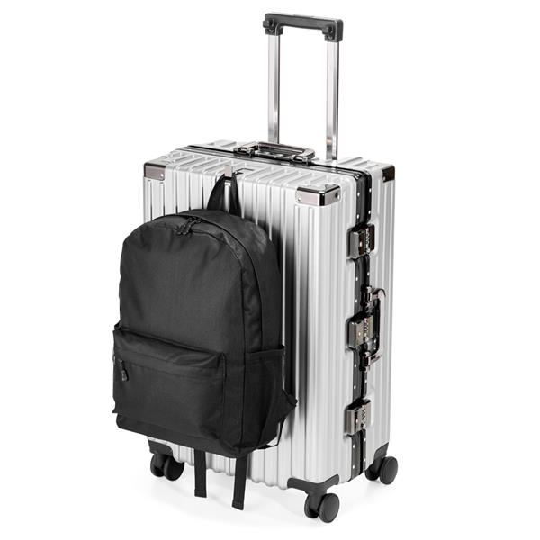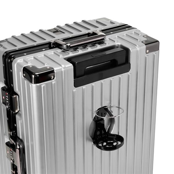 Mala de viagem 77 litros feita em plástico com acabamento em alumínio, contém cadeado numérico TSA. Compartimentos internos com bolso telado, bolso plástico para itens molhados e cinta compressora para roupas. A mala possui duas alças de mãos, puxador retrátil com regulagem de tamanho e suporte para celular, suporte porta bolsa, suporte para copo ou garrafa, quatro rodinhas 360º e apoios laterais.