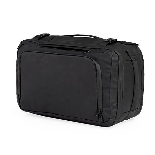 Mochila com capacidade máxima de 28 litros confeccionada em Couro Sintético impermeável. Possui compartimento principal com cinta compressora de engate plástico e bolso em PEVA com fechamento em zíper para objetos úmidos. Conta ainda com dois compartimentos frontais em tamanhos diferentes, sendo um deles com bolso em tela de malha, além de dois compartimentos traseiros, um com espaço para notebook de até 17,3 polegadas e outro para armazenamento das alças de costas, permitindo o uso em formato de mala Dispõe de dois pares de engates compressores nas laterais, além de engate para peitoral e revestimento acolchoado nas alças de mão e na área das costas.