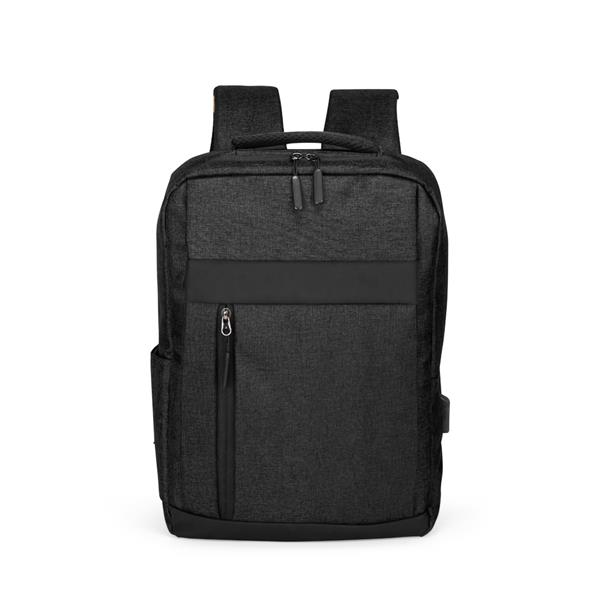 Mochila em nylon Oxford impermeável com detalhes em couro sintético, capacidade para até 14 litros, fechamento em zíper com puxadores em plástico e nylon. Possui compartimento interno com bolsos de tamanhos variados e divisória para notebooks de até 15,6 polegadas. Apresenta dois compartimentos frontais com abertura lateral, além de entrada para cabo USB e bolso lateral aberto. Dispõe também de alça de mão em poliéster reforçado e duas alças para as costas com revestimento em espuma respirável.