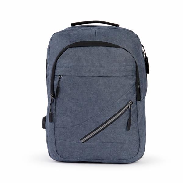 Mochila em tecido Oxford resistente à água com capacidade máxima de 18 litros. Possui compartimento principal com quatro bolsos pequenos e divisória acolchoada para notebook de até 15,6 polegadas. Apresenta um compartimento frontal e dois bolsos em tamanhos diferentes, um deles com faixa refletiva na área do zíper, além de um bolso e um adaptador USB posicionados em laterais opostas. Dispõe de alça superior de mão e duas alças de ombro, estas com revestimento em tecido respirável. Obs.: A posição do adaptador USB pode variar conforme o lote do produto.