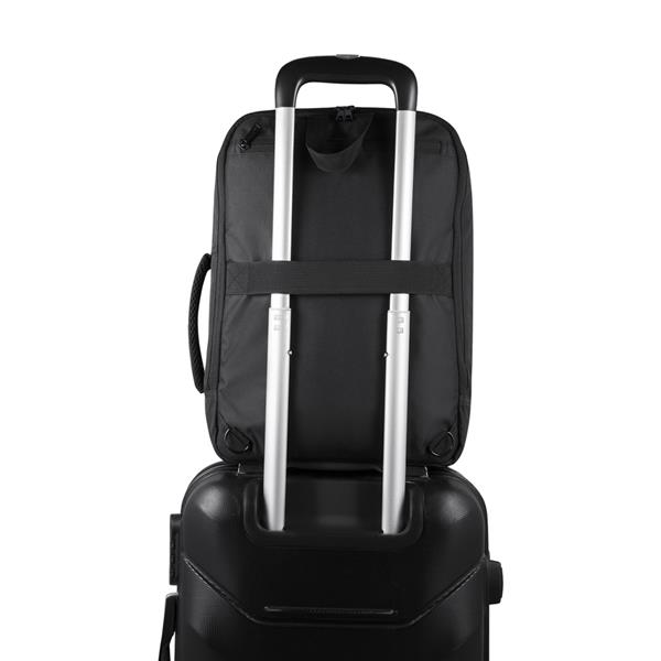 Mochila/pasta em poliéster 300D com detalhe em PU e interior em poliéster 210D. Possui alças lateral e de ombro acolchoadas, alça de mão, engate para mala de viagem, bolso frontal com zíper, compartimento interno para notebook até 15,6” e bolso traseiro para ocultar as alças.