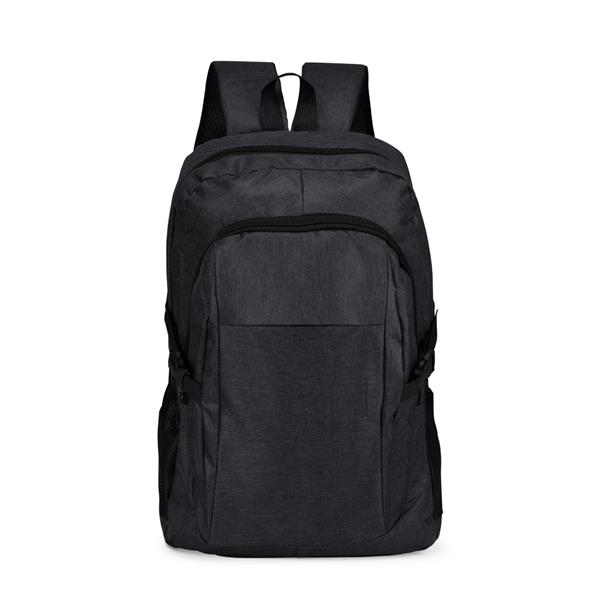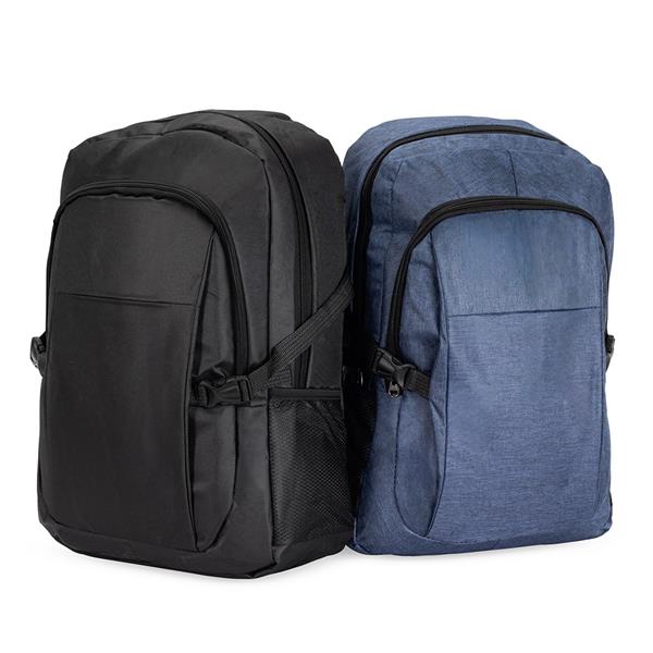 Mochila confeccionada em Oxford 300D resistente à água com capacidade máxima de 14 litros. Possui compartimento principal com divisória para organização de objetos internos e outro, localizado na parte frontal, com três bolsos internos em diferentes tamanhos. Conta ainda com bolsos laterais em tela de malha com elástico, um par de fivelas de engate lateral em plástico, alça superior em nylon e alças para as costas com revestimento externo em tecido respirável.
