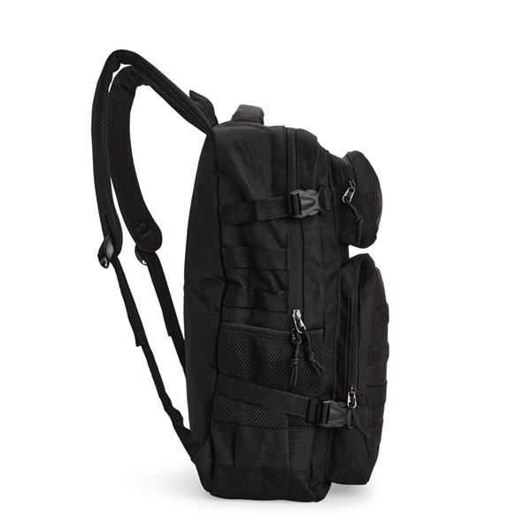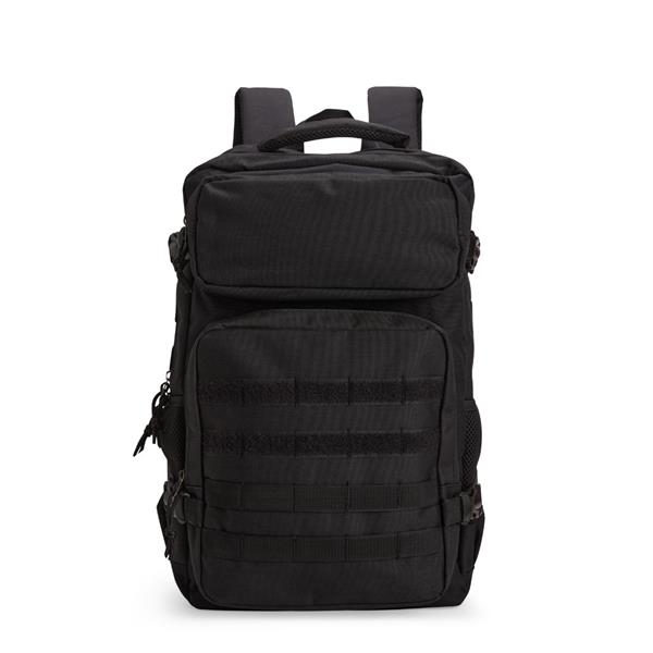 Mochila em Oxford 600D impermeável, fechamento em zíper com fechamento em zíper e puxadores em cordão de nylon, e capacidade de 24 litros. Possui divisória interna para notebooks de até 15,6 polegadas. Conta com dois compartimentos frontais de tamanhos diferentes, sendo um com tiras em velcro para fixação de patches e costura compatível com o encaixe de bolsos modulares, além de dois bolsos laterais em tela de nylon com elástico e cintas compressoras laterais. Dispõe ainda de alça superior e duas alças acolchoadas para as costas. Acompanha plaquinha metálica personalizável.
