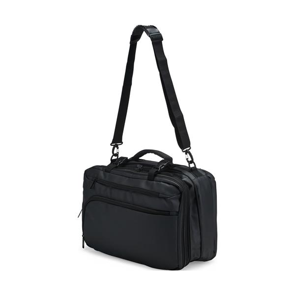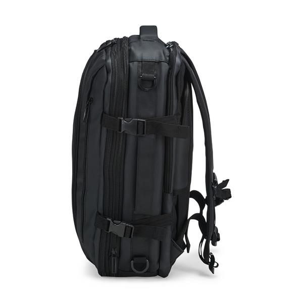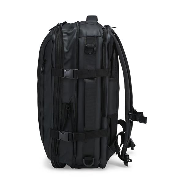 Mochila em nylon com uma camada de PU impermeável com capacidade máxima de 28 litros. Conta com abertura expansível e fivelas laterais ajustáveis para melhor aproveitamento do espaço interno. Possui compartimento principal em poliuretano termoplástico e duas divisórias de tamanhos distintos, além de bolsos frontais, um lateral em tela e outro traseiro com divisória para notebook de até 15,6 polegadas. Traz alças acolchoadas em espuma respirável, alça lateral para transporte vertical e alça de ombro ajustável em nylon.