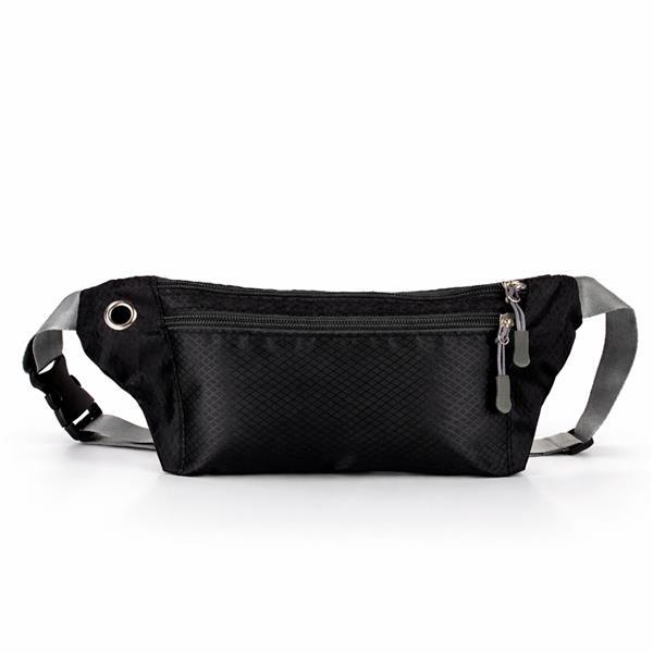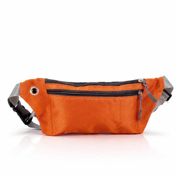Pochete esportiva confeccionada em poliéster filamentado resistente à água. Possui cinto ajustável com fivela plástica de encaixe, saída para fones de ouvido e três compartimentos com fechamento em zíper, sendo dois na parte frontal e um traseiro antifurto.