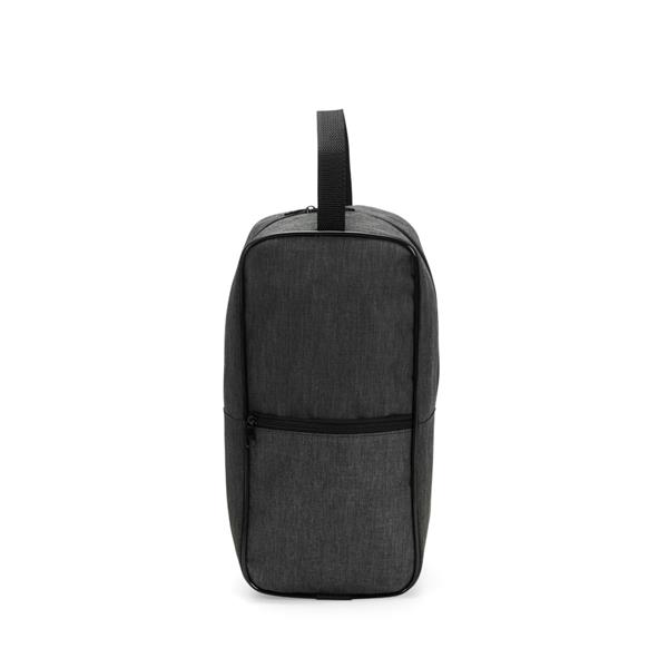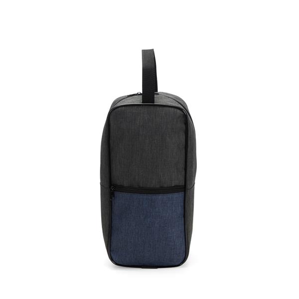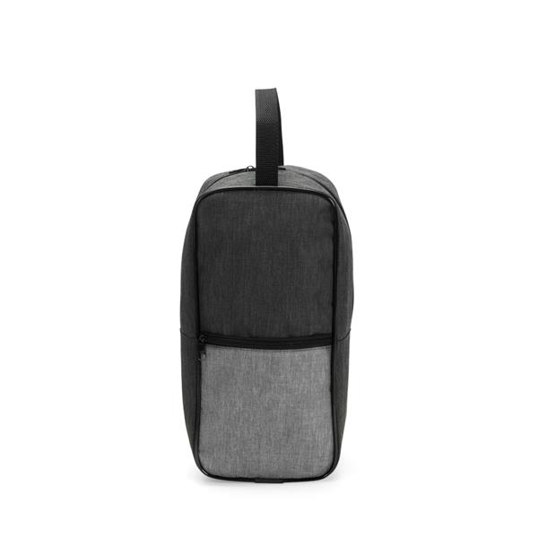 Bolsa porta tênis resistente à água confeccionada em poliéster mesclado com PVC. Conta com compartimento principal e bolso frontal com fechamento em zíper, além de alça em nylon para transporte.