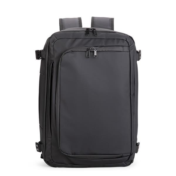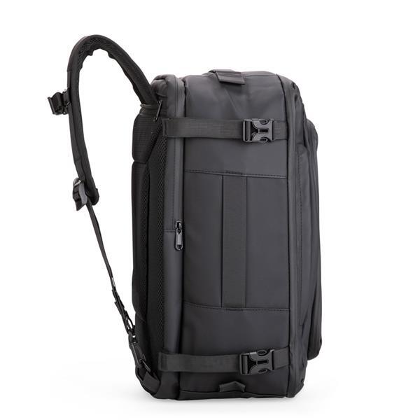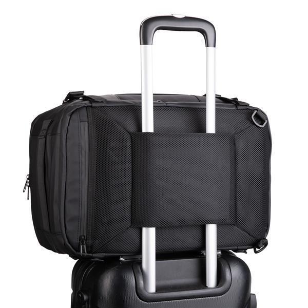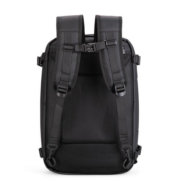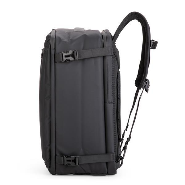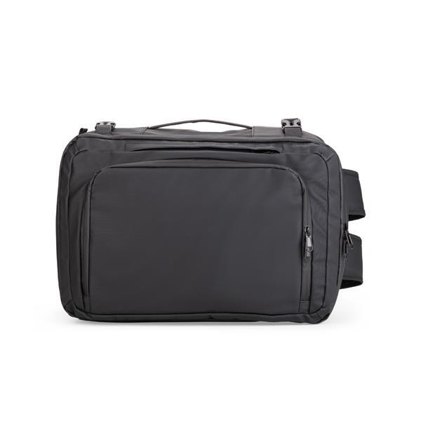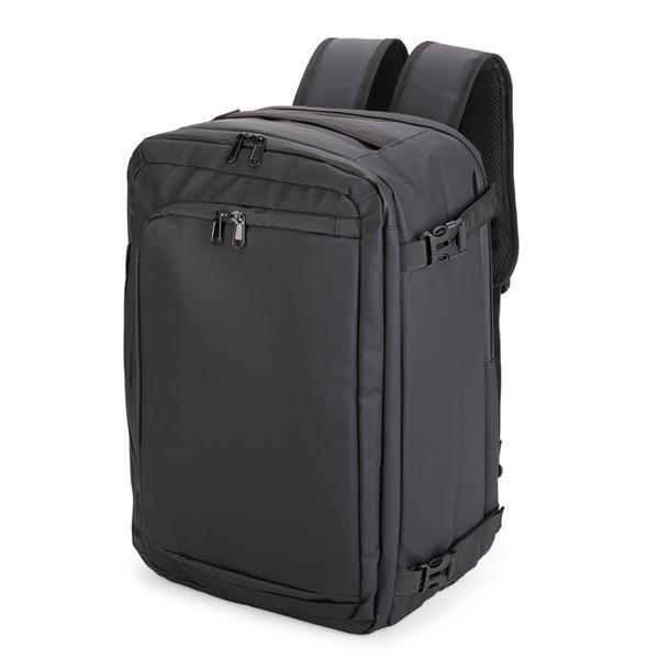 Mochila com capacidade máxima de 28 litros confeccionada em Couro Sintético impermeável. Possui compartimento principal com cinta compressora de engate plástico e bolso em PEVA com fechamento em zíper para objetos úmidos. Conta ainda com dois compartimentos frontais em tamanhos diferentes, sendo um deles com bolso em tela de malha, além de dois compartimentos traseiros, um com espaço para notebook de até 17,3 polegadas e outro para armazenamento das alças de costas, permitindo o uso em formato de mala Dispõe de dois pares de engates compressores nas laterais, além de engate para peitoral e revestimento acolchoado nas alças de mão e na área das costas.