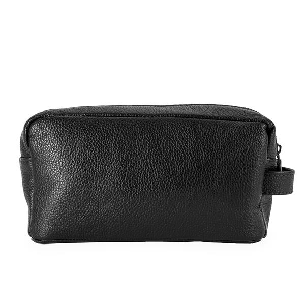 Nécessaire em couro, com fechamento em zíper, alça lateral de mão e plaquinha presa a cordão de nylon.