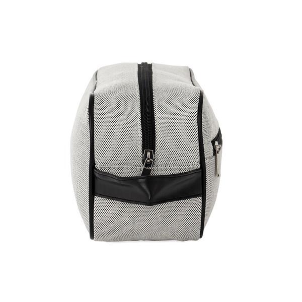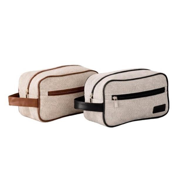 Nécessaire confeccionada em lona e fechamento em zíper. Possui bolso frontal e compartimento principal com três bolsos internos, além de alça lateral e plaquinha costurada em couro sintético.