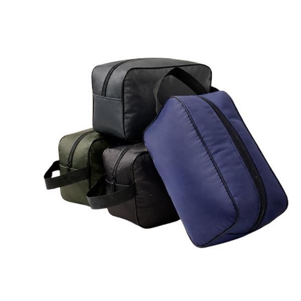 Nécessaire impermeável em poliéster com revestimento em PVC, fechamento em zíper e alça de mão em nylon.