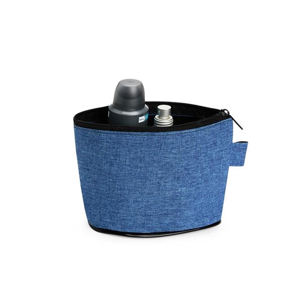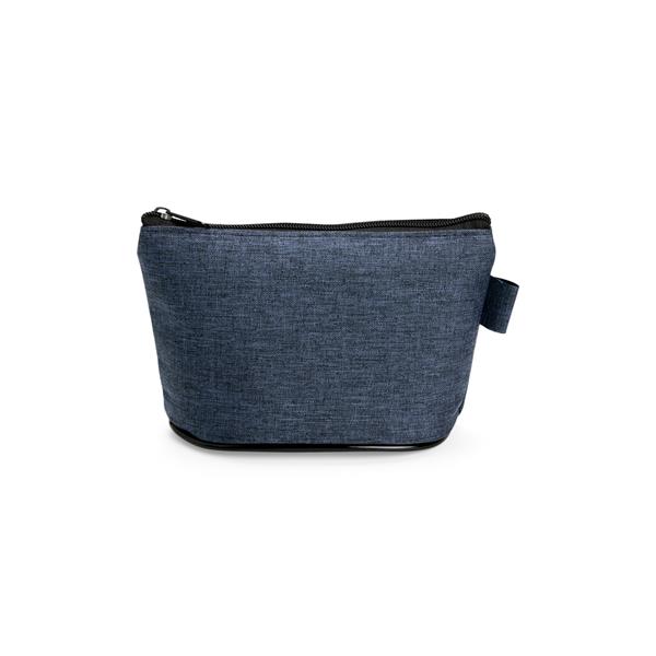 Nécessaire resistente à água e confeccionado em poliéster com mescla de PVC. Possui fechamento em zíper e uma pequena alça para fixação de chaveiro ou gancho.