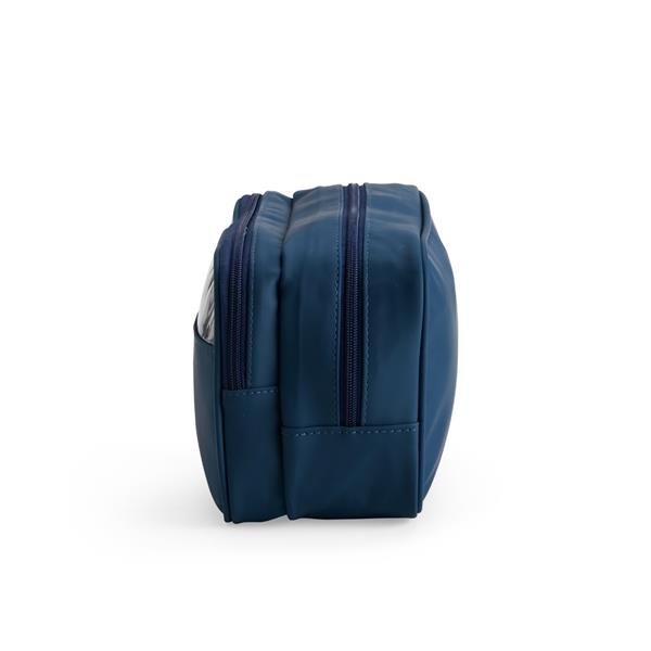 Nécessaire confeccionada em filme sintético de poliuretano impermeável. Possui dois bolsos no compartimento interno principal, sendo um com fechamento em zíper e outro em tela de nylon. Dispõe ainda de compartimento frontal com viseira e revestimento interno em PVC, ideal para guardar itens molhados.