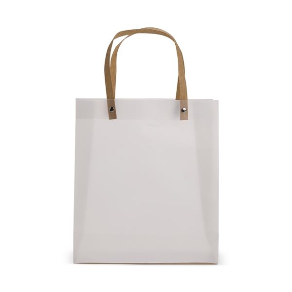 Sacola plástica com acabamento fosco e alças em papelão fixadas por botões metálicos.